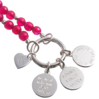 3 handgefertigte Gravurplättchen warten auf die Namen Ihrer Liebsten, Ihre Botschaften, besondere Wünsche oder Ihre persönlichen Daten, wir gravieren es gerne und machen diese Kette zu Ihrem Unikat. Die facettierten Achate sind in pink ein Hingucker, tragen Sie die Kette kurz oder lang, der Wechselring macht es möglich!