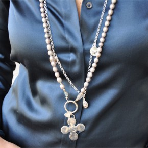 Die farbenfrohe Kette, aus großen grauen, weissen, braunen und rosefarbenen Süsswasserperlen, kann lang oder kurz getragen werden und ist ein phantastischer Hingucker! An dem Wechselring ist das große handgearbeitete Kreuz, welches mit einer kleinen gravierten Botschaft oder Ihrem Monogram zu einem Unikat wird. Poliert oder mattiert? Handgefertigt in Hamburg nur für Sie. Weitere Informationen finden...